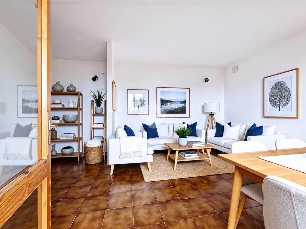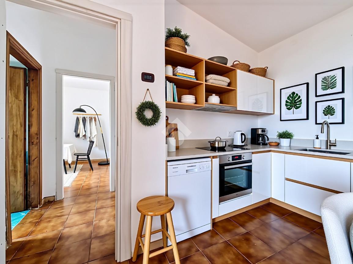 All'ingresso si viene accolti da un'ampia zona giorno con angolo cottura molto luminosa, data la presenza di un’ampia finestra vista mare.