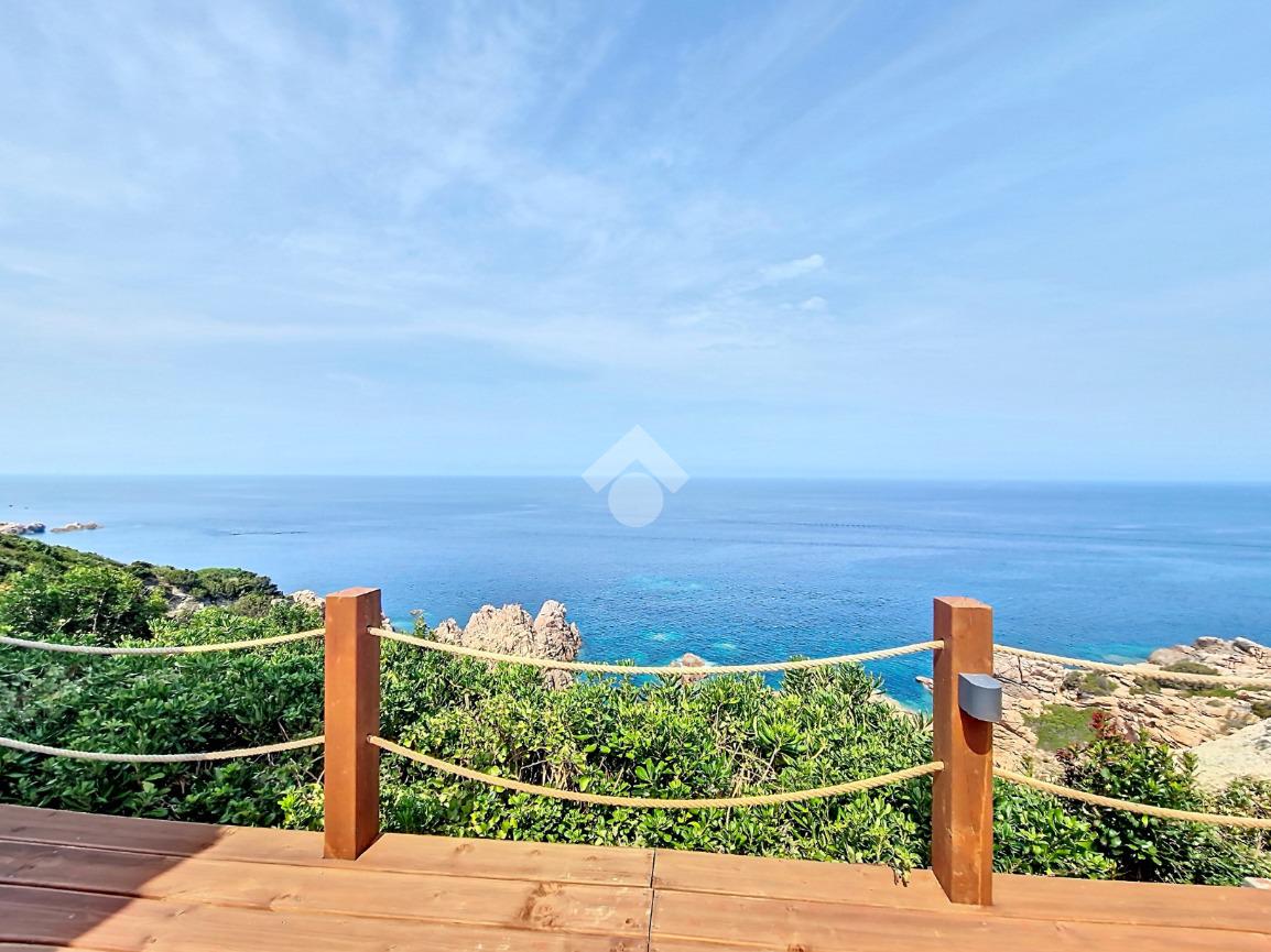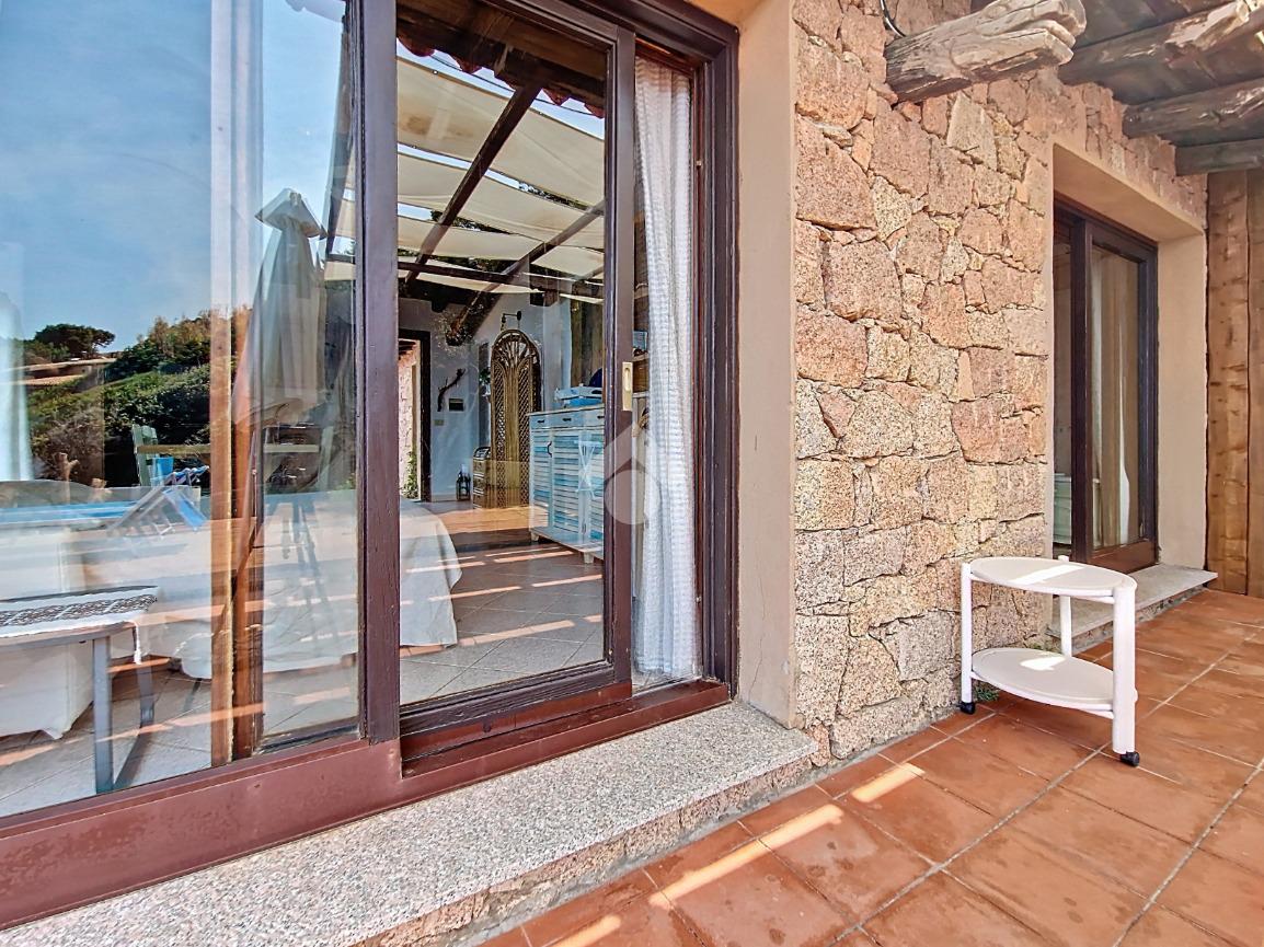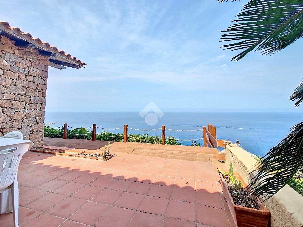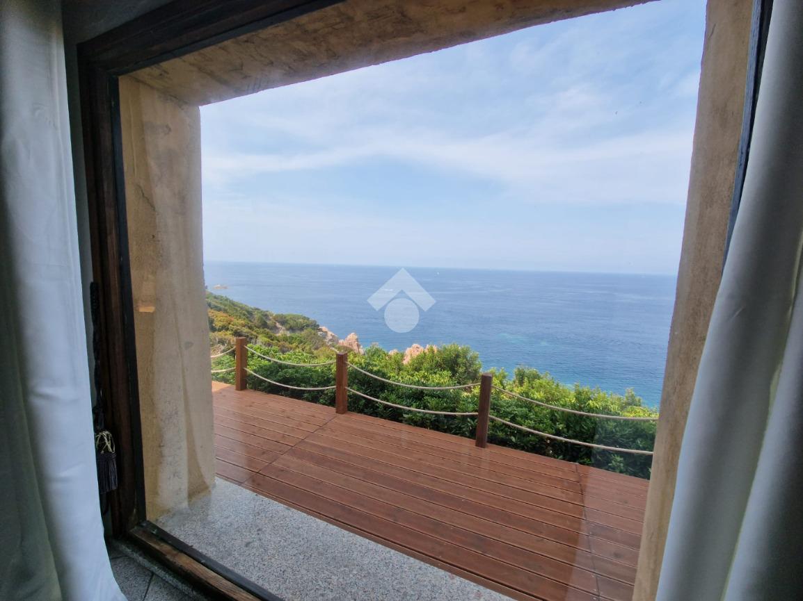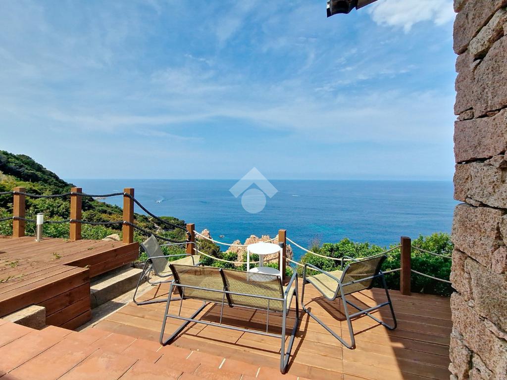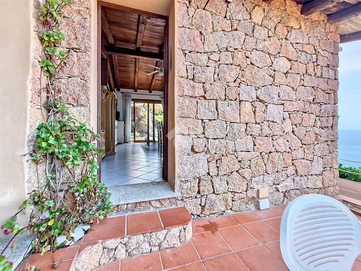 Accediamo alla soluzione mediante diversi gradini e veniamo accolti nel terrazzo di proprietà, dal quale possiamo godere di una vista mozzafiato sul mare e sulle rocce granitiche rosse tipiche della zona.