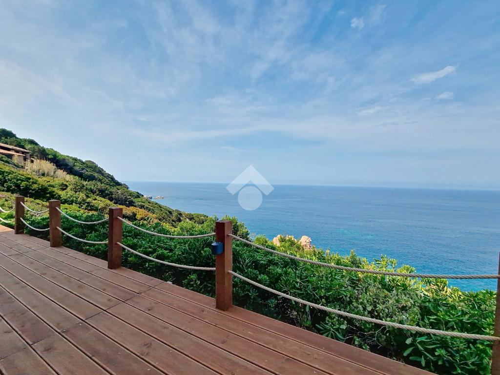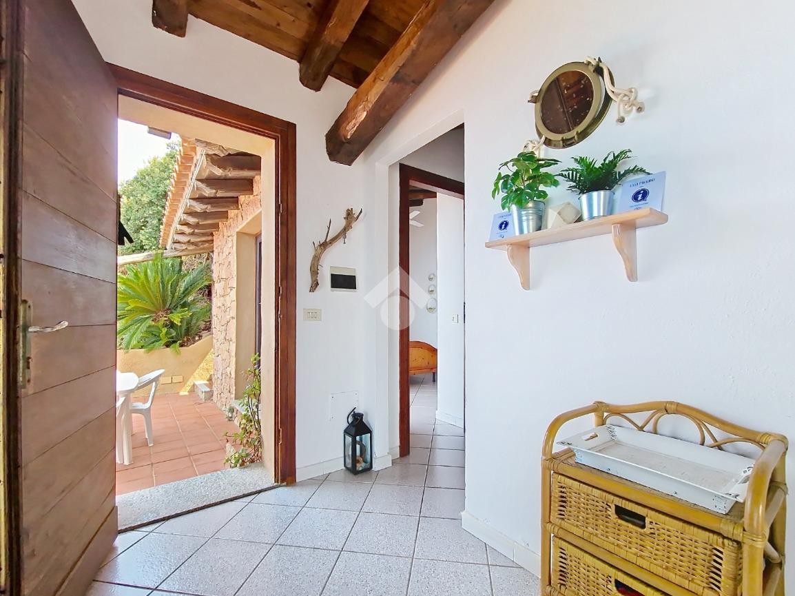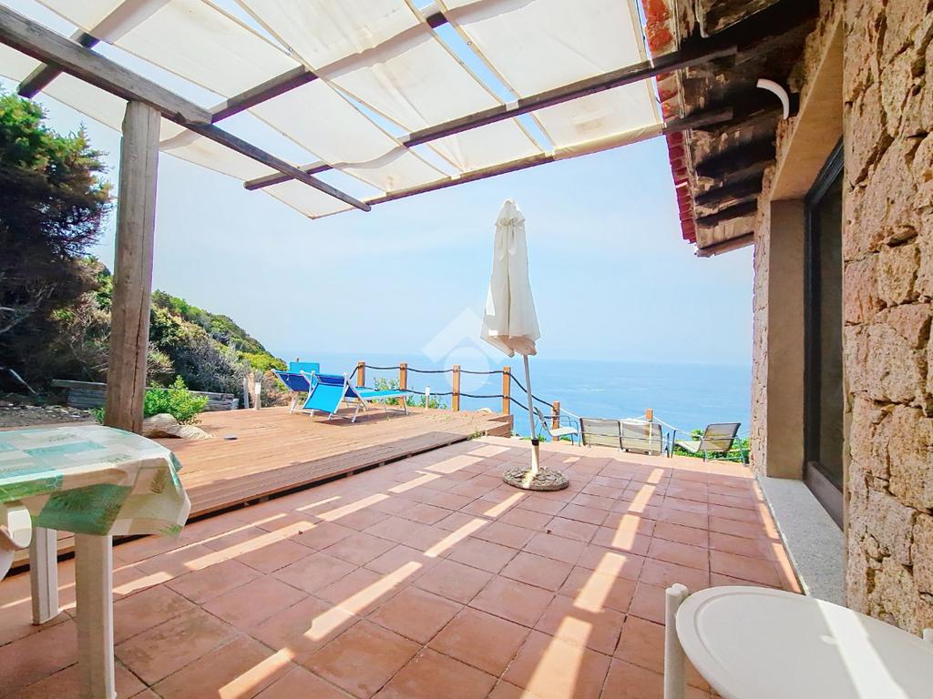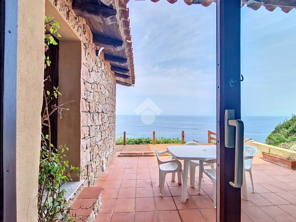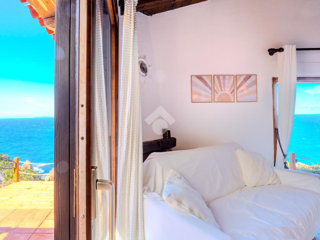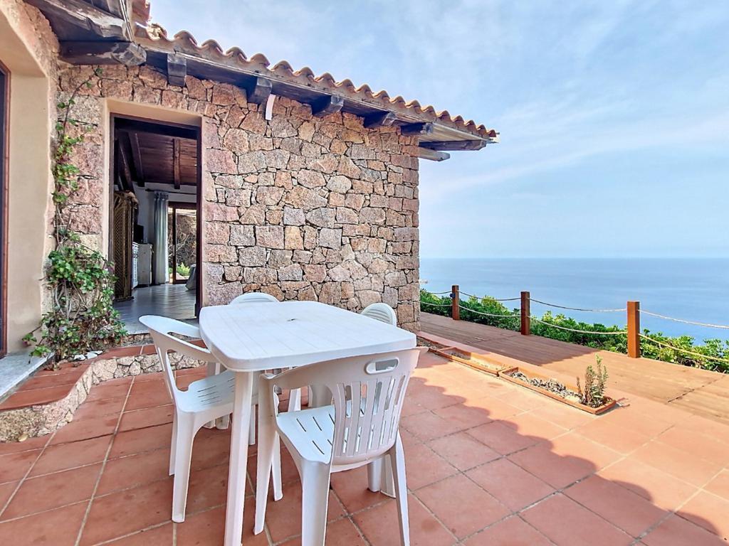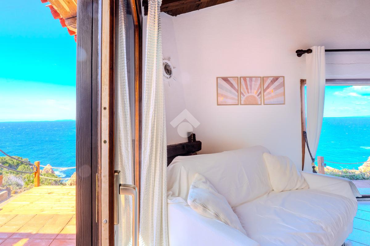Accediamo alla soluzione mediante diversi gradini e veniamo accolti nel terrazzo di proprietà, dal quale possiamo godere di una vista mozzafiato sul mare e sulle rocce granitiche rosse tipiche della zona.
