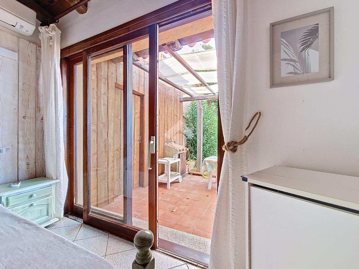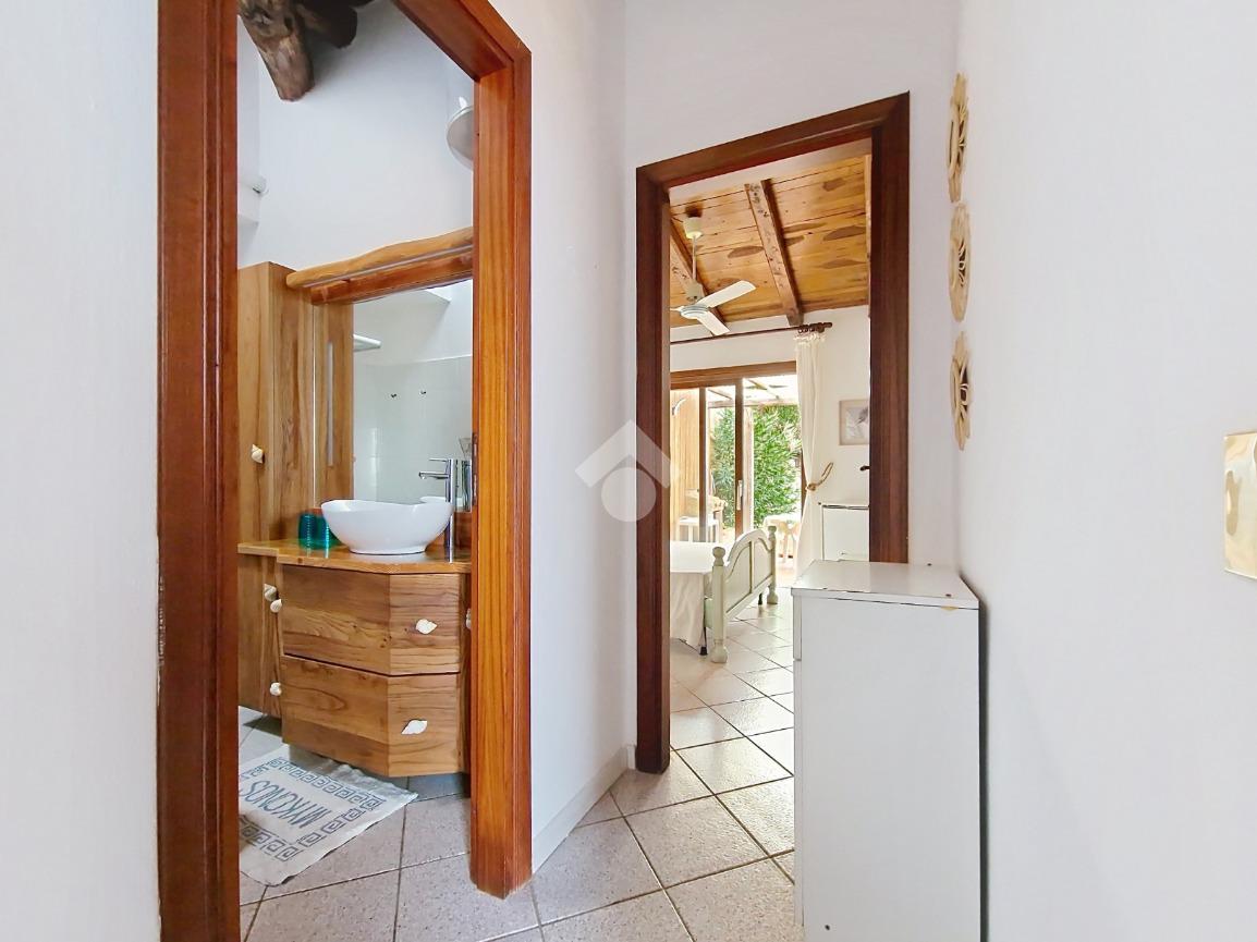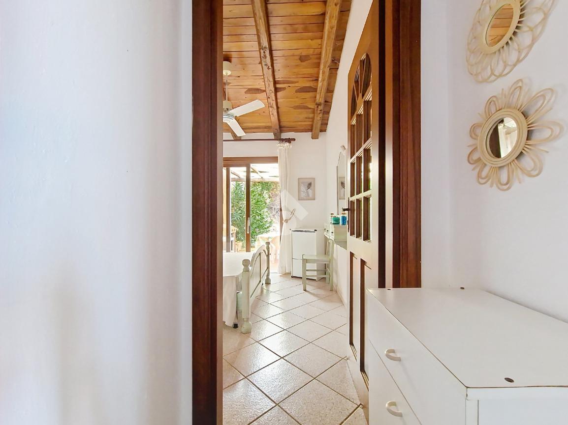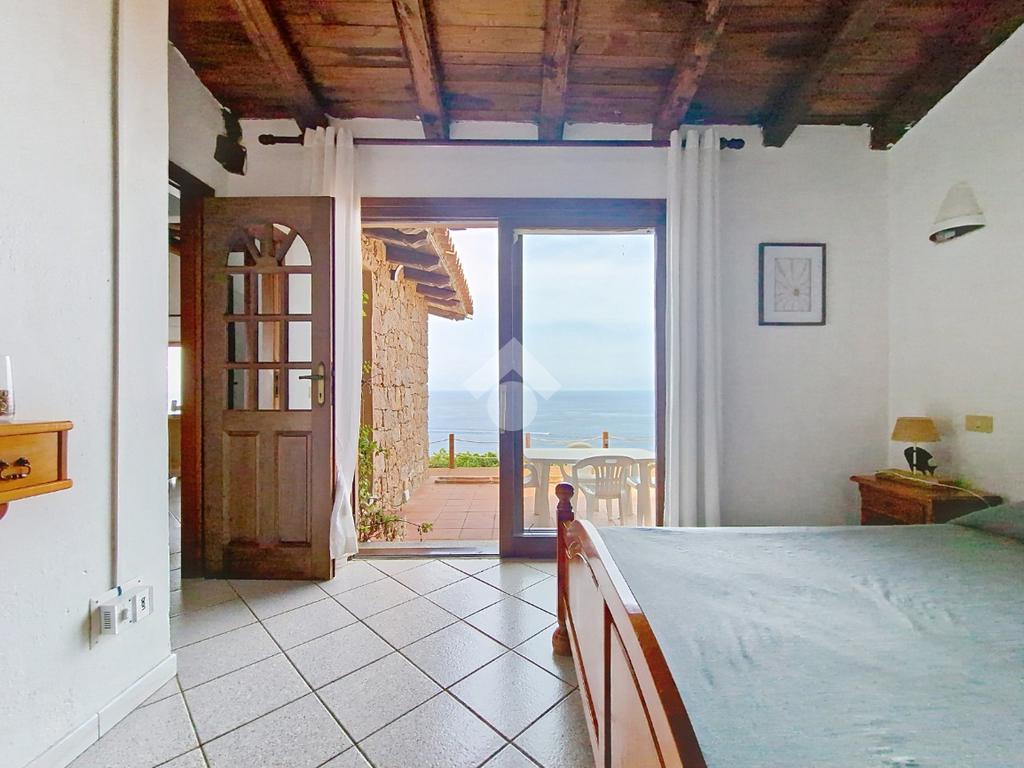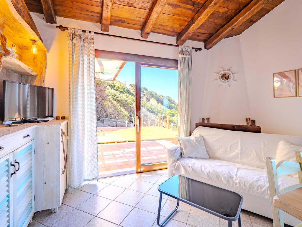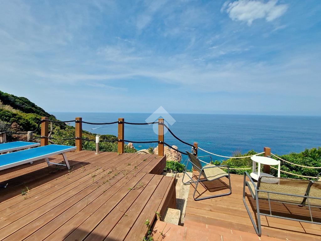 Accediamo alla soluzione mediante diversi gradini e veniamo accolti nel terrazzo di proprietà, dal quale possiamo godere di una vista mozzafiato sul mare e sulle rocce granitiche rosse tipiche della zona.